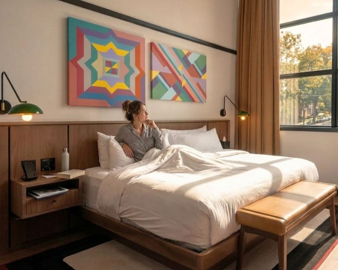 As you enter your room, you’ll be greeted by a warm and inviting atmosphere, complete with luxurious French bedding, soft lighting, and modern decor. You’ll find everything you need for a comfortable stay, including high-speed internet, Smart TV and a curated assortment of in-room amenities.
